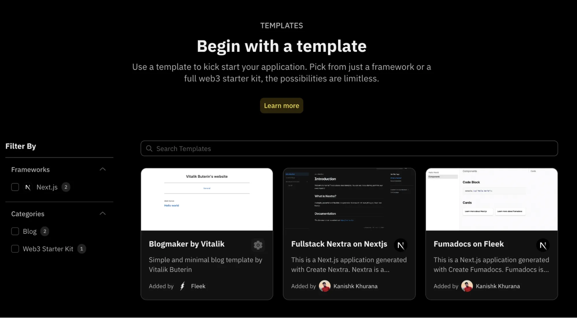 Fleek Platform offers a set of templates of popular frameworks like Next.js, Astro, React, Nuxt, Vue, and more to simplify deployment.