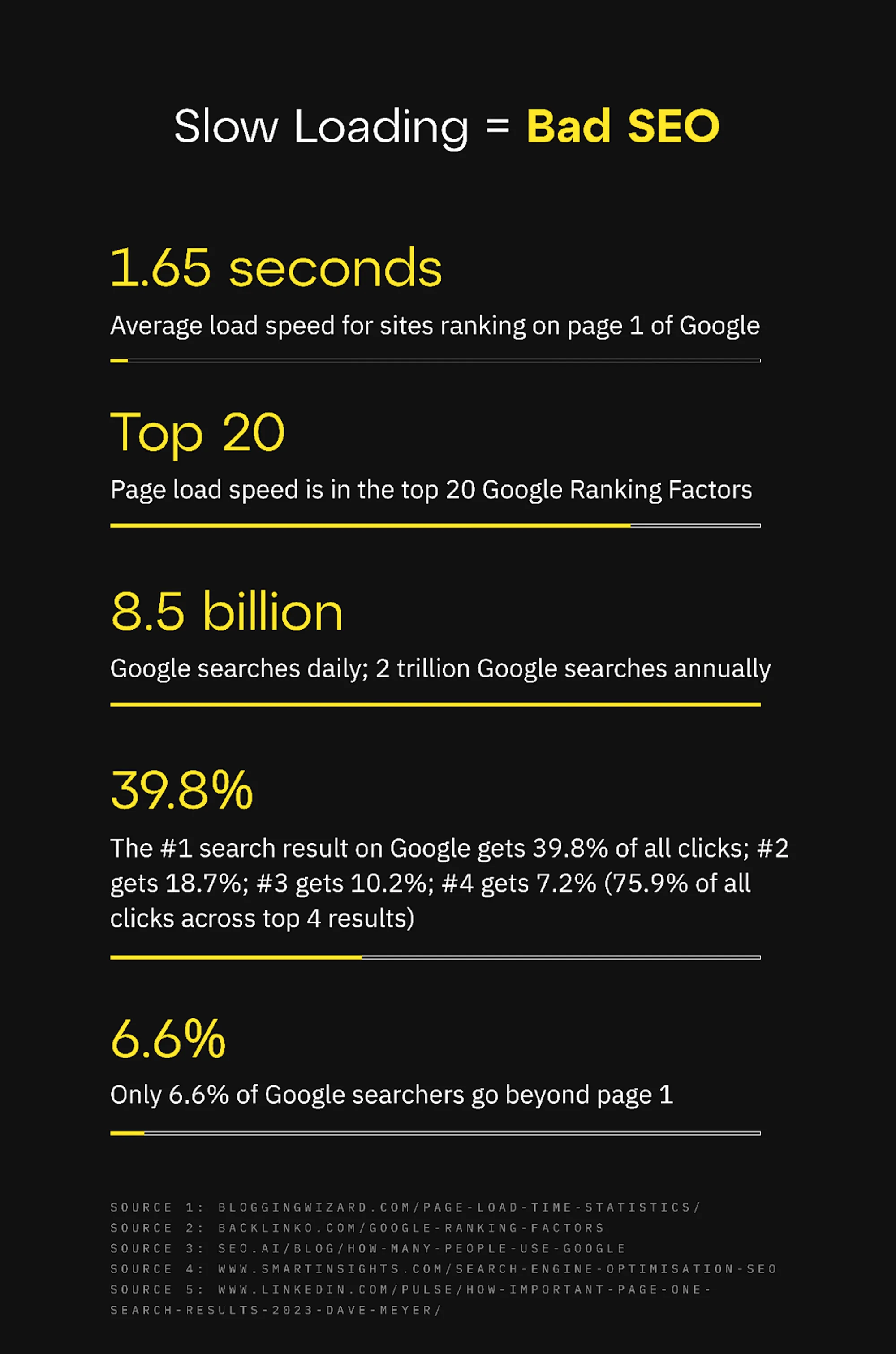 SEO is super important for most sites/apps because it helps you gain visibility for search queries related to your product or service organically. And with 8.5 billion Google searches a day (2 trillion a year), getting organic search traffic can have a very material impact on the success of your project. But as the data shows, Google has no interest in showing users slow-loading sites/apps, as they know better than anybody how big of an impact slow loading has on user behavior. Google just like everybody else wants their users to have a good experience, so they have no interest in showing them slow-loading sites/apps.
