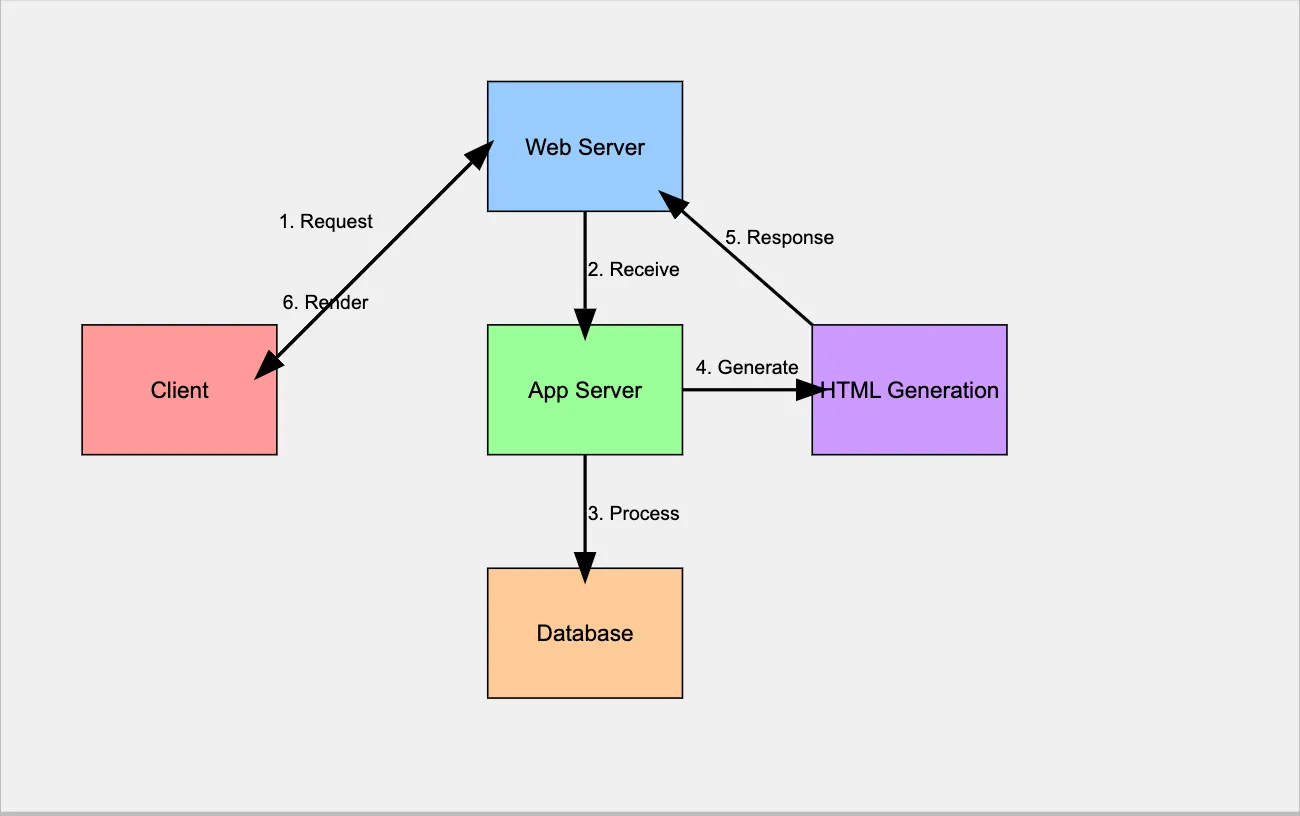 In this workflow, the reliance on the server side to do most of the heavy lifting poses challenges like higher server load, complex caching, and real-time data fetching.