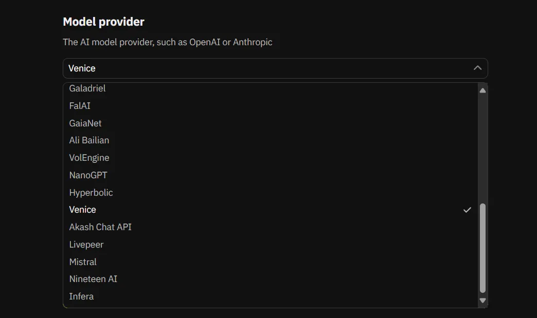 - In the UI, select Venice as your model provider