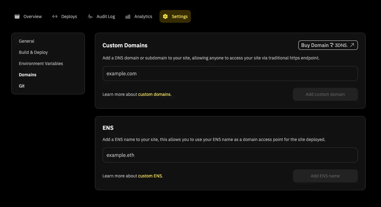 Now, after owning a 3DNS domain, developers can use the domain as a digital pointer to any content or website. To connect a 3DNS domain with a website or content, developers can use Fleek which offers a simple, user-friendly interface to make this possible.