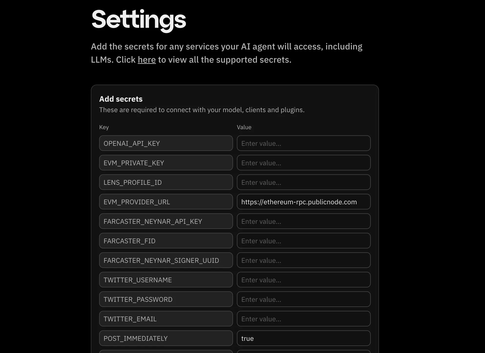 - Complete your AI agent setup by configuring its settings. Enter the required credentials to enable seamless integration with external services like OpenAI and social platforms. Once filled, click “Review character”.