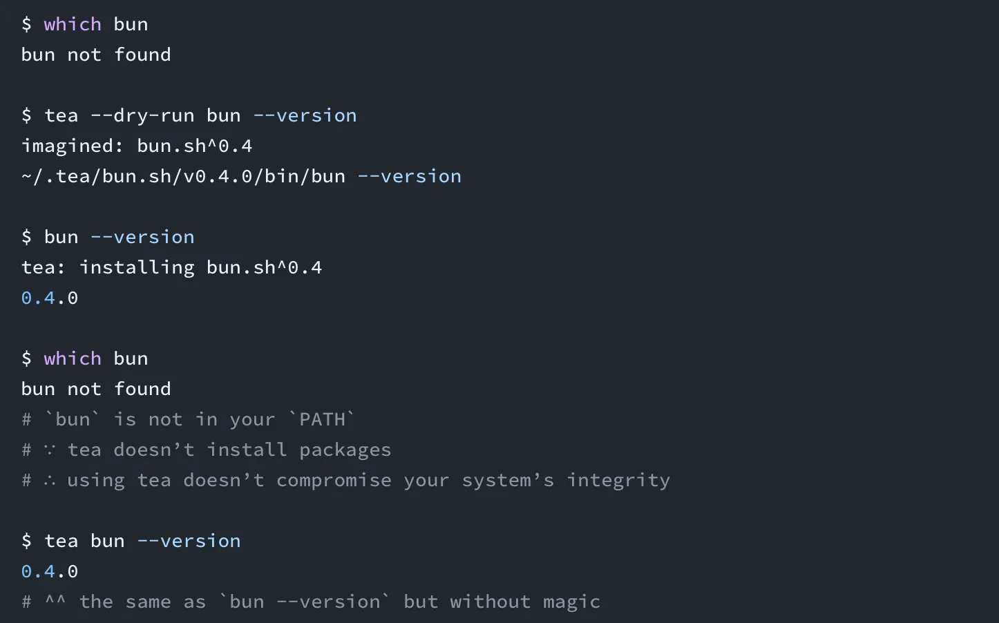 Therefore, when running any library or script, Tea will automatically deploy to look for the necessary packages or dependencies. If you donāt have them, then Tea installs them encapsulated in ~/.tea, to be able to retrieve them later. Packages are never installed in PATH, and arenāt accessible from the rest of the system.