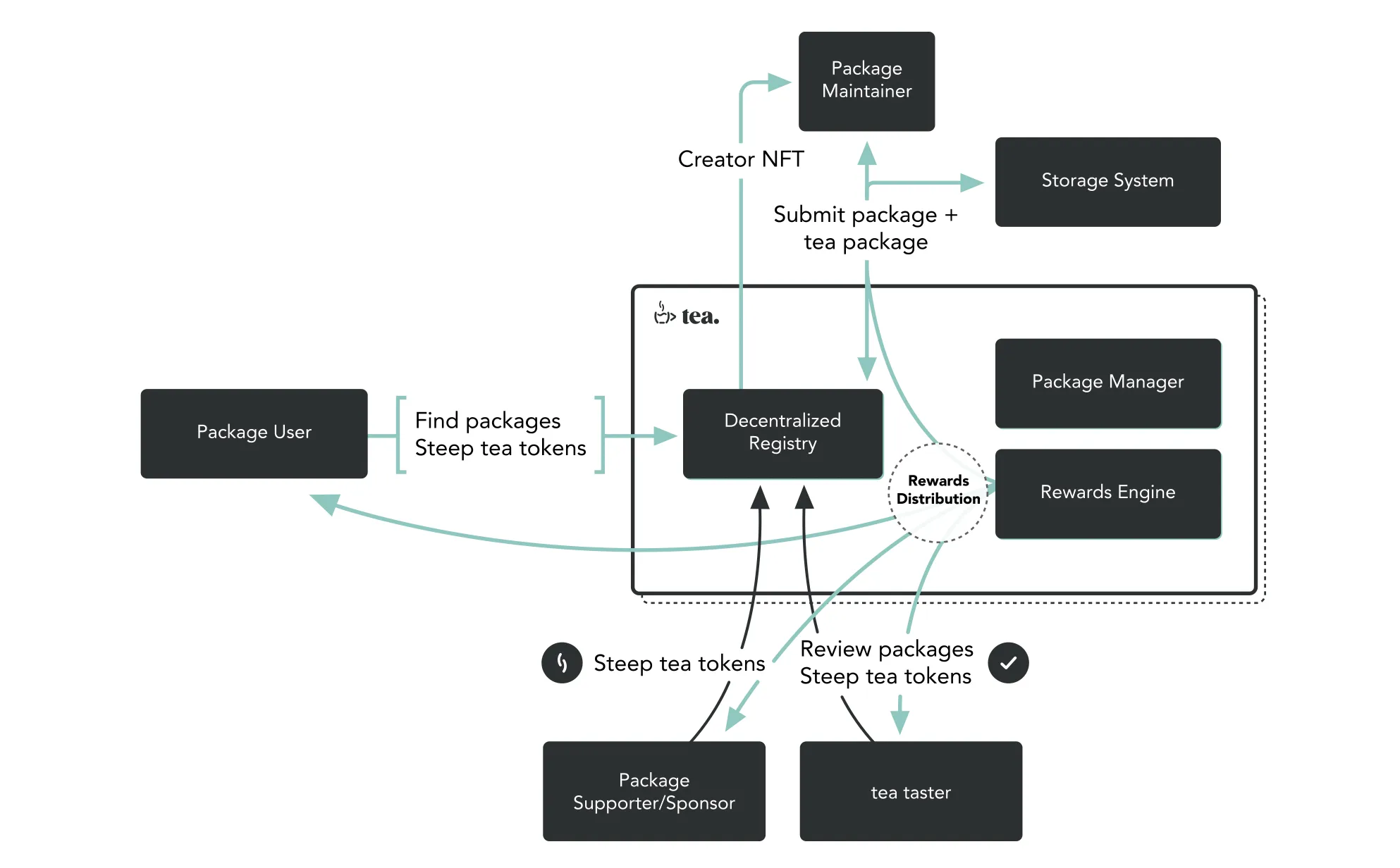 How is Tea going to change that? Moving the package registry on-chain, and essentially creating a protocol ātea token includedā to enable a reward platform for developers: package maintainers would publish their releases to a decentralized registry powered by a fault-tolerant blockchain. This means automatic & secure indirect compensation to developers by creators, users and peer reviewers in the developer world by means of the tea token (or, as the whitepaper describes it, āsteeping teaā).