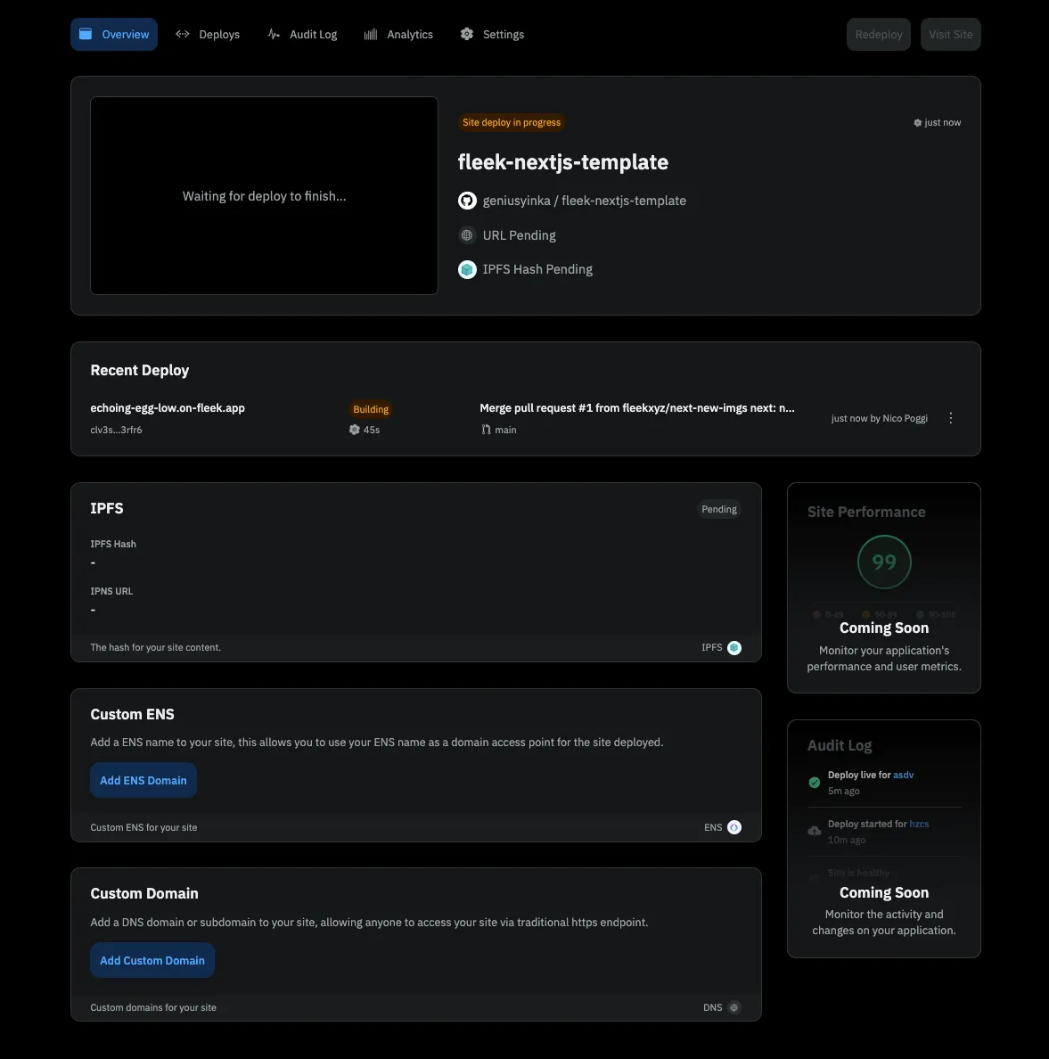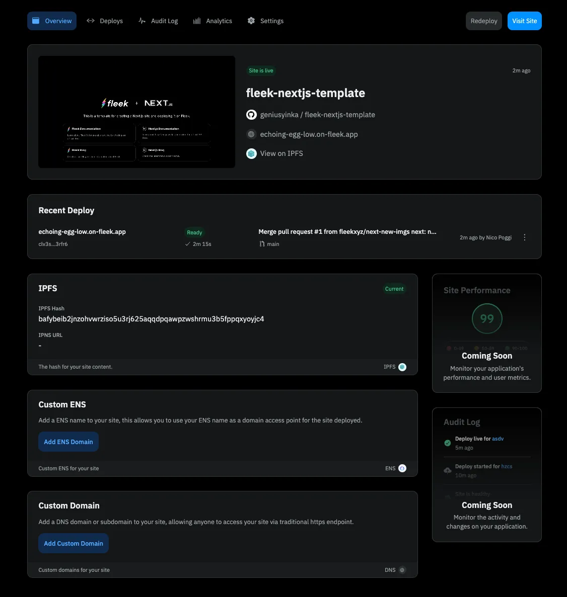 From the Fleek.xyz dashboard, you have the ability to manage a custom domain or ENS address for your site, as well as see deployment history and quickly manage site settings.