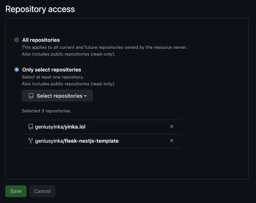 Once you’ve selected the repo(s) you would like to grant Fleek access to, click on Save. You should see this— the image below shows a list of repos Fleek has access to.