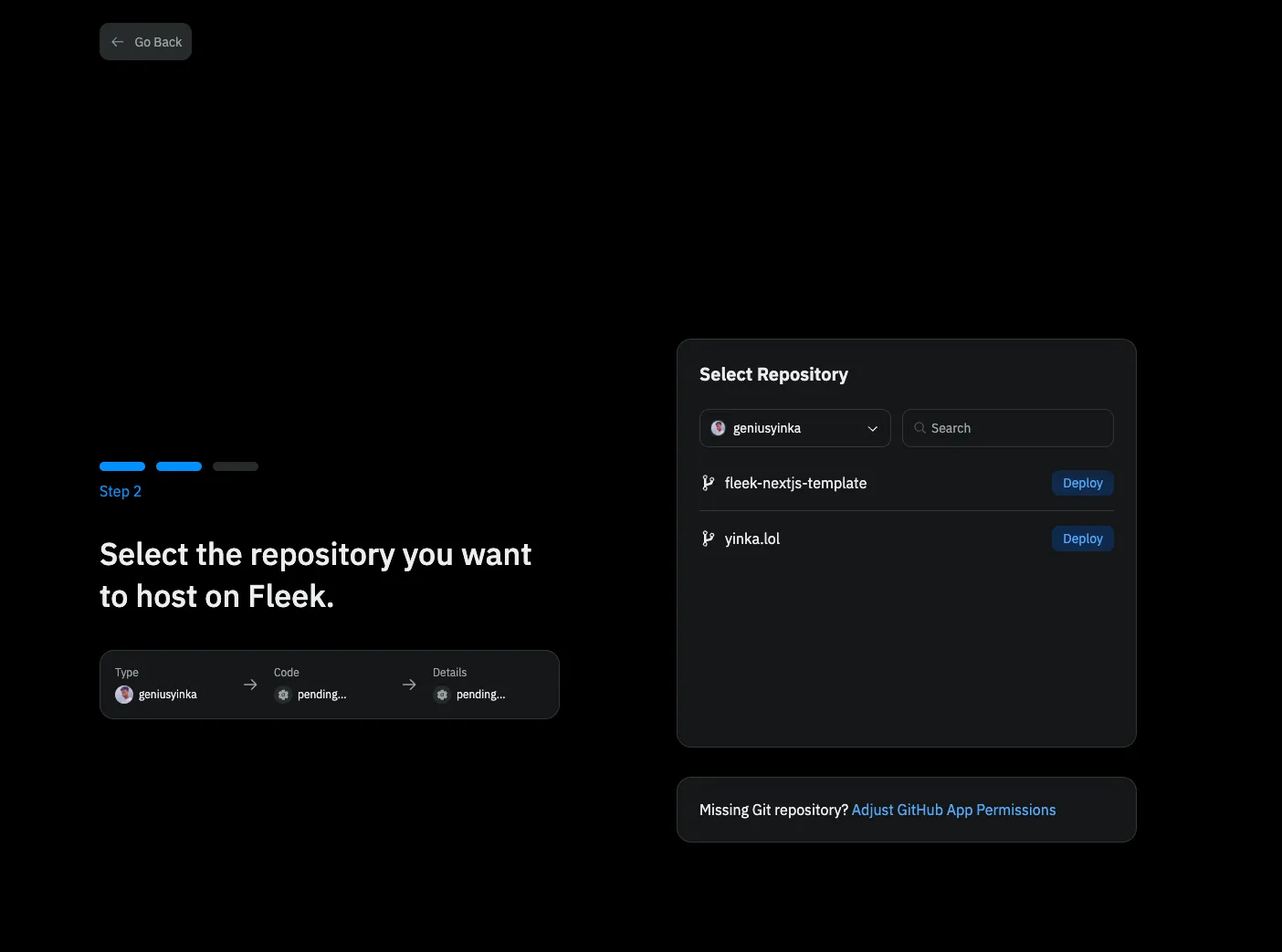 💡 If you want to grant Fleek access to a different repo, simply click on the ‘Adjust GitHub App Permission’ button underneath.