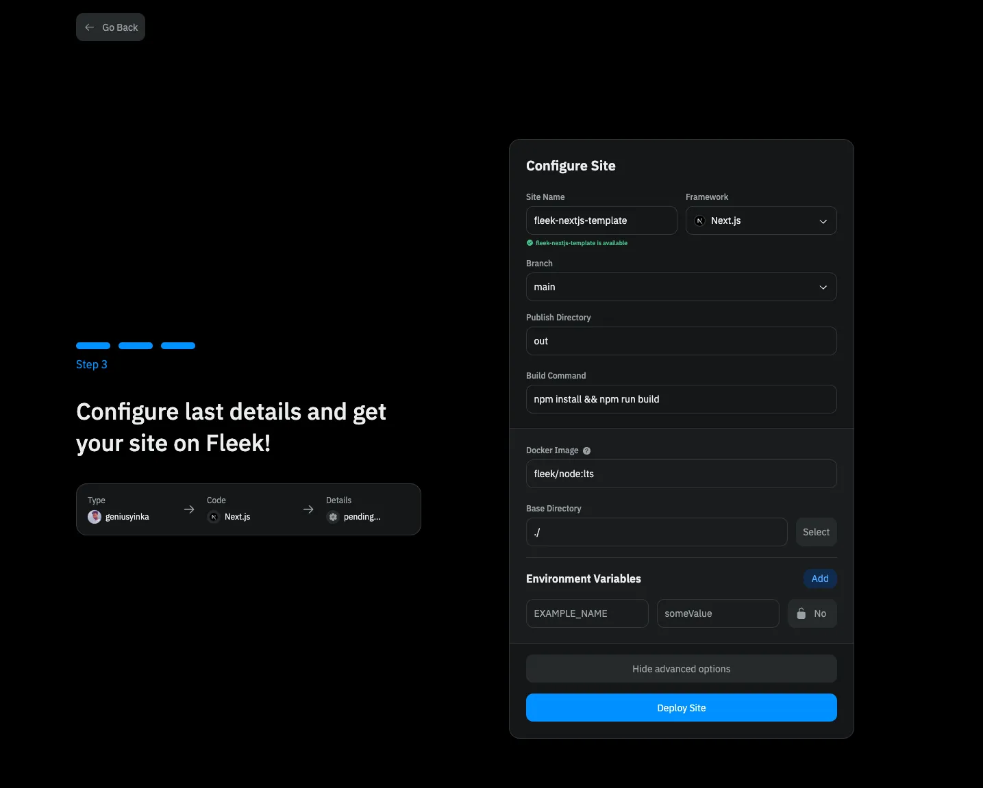 Site Nameto anything you want. - The framework is automatically detected by Fleek.