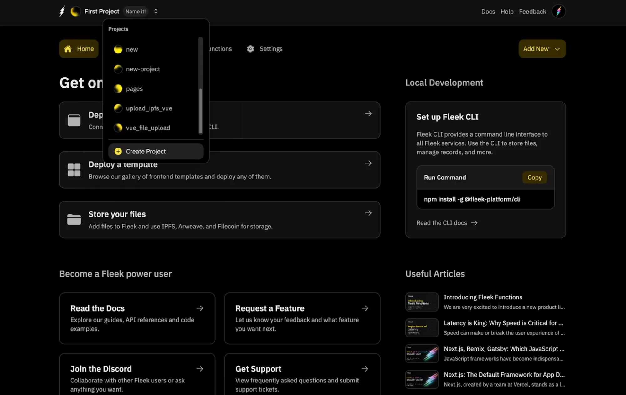 Head over to the Fleek dashboard, Create a new project, and give it a name. You’ll be automatically switched to that project.