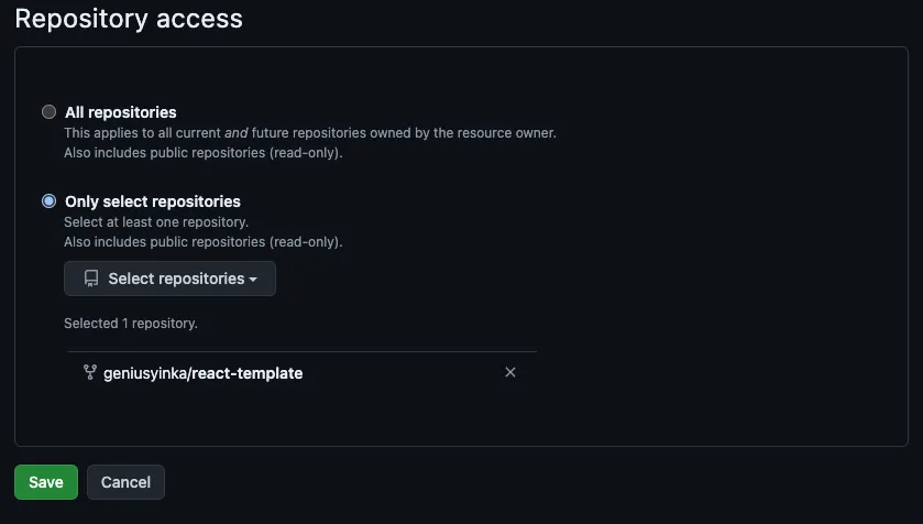 Choose the preferred account or organization. This will lead you to a page where you can grant access to either specific repositories or all repositories.