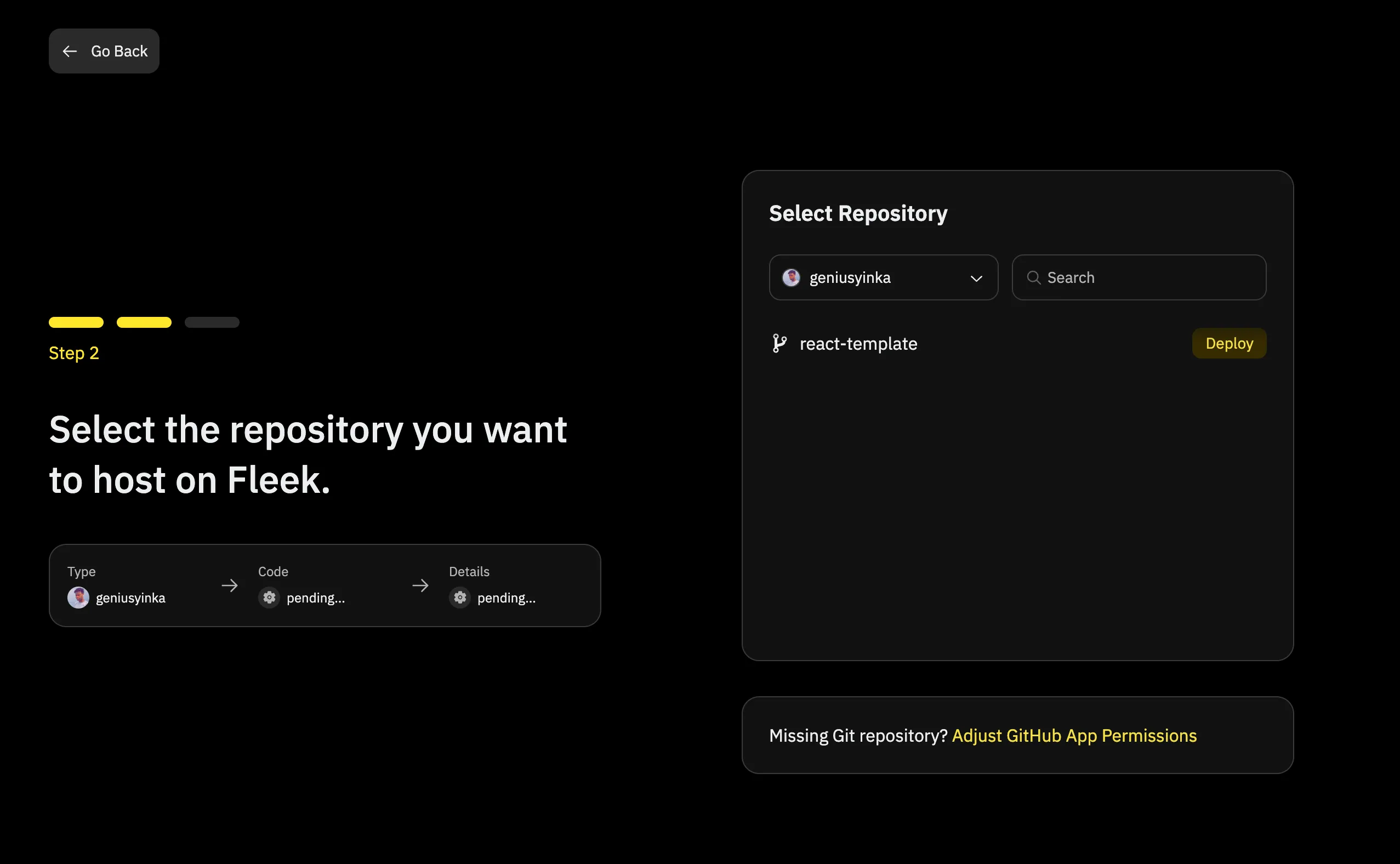 💡 To grant Fleek access to a different repository, simply click on the ‘Adjust GitHub App Permission’ button below.