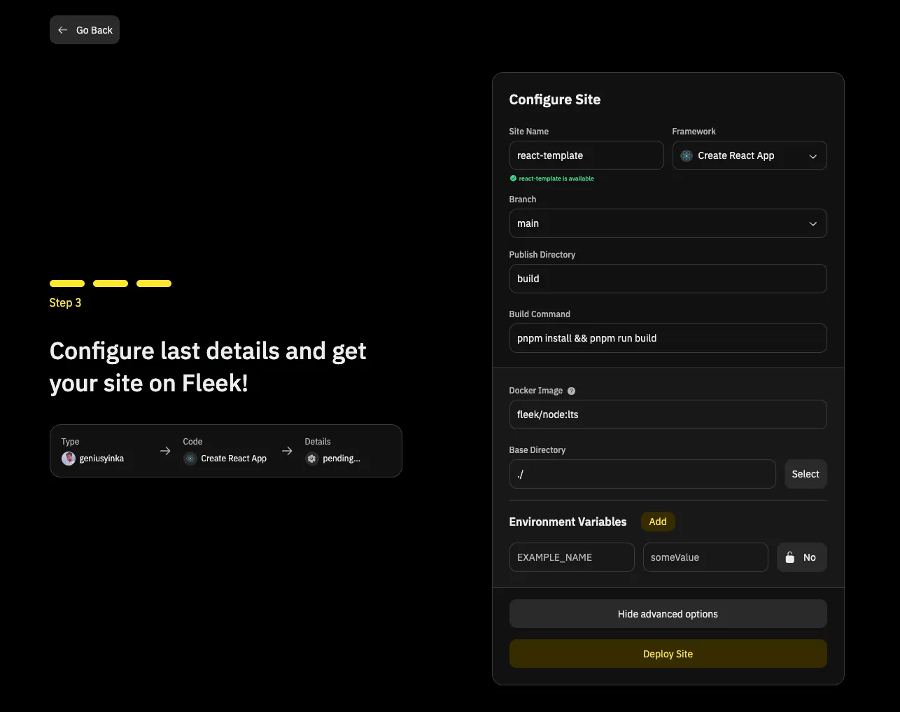 Publish Directoryis also automatically determined by Fleek based on the Default publish directory by the framework. If you’ve made any modifications, change the name to reflect this. - The