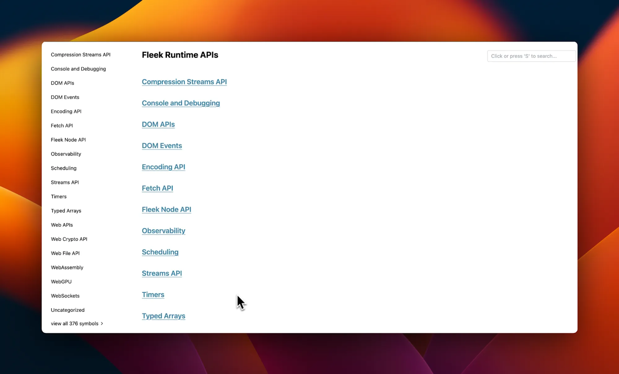 Fleek offers support for many runtime APIs that a typical JavaScript runtime should have which are documented here.
