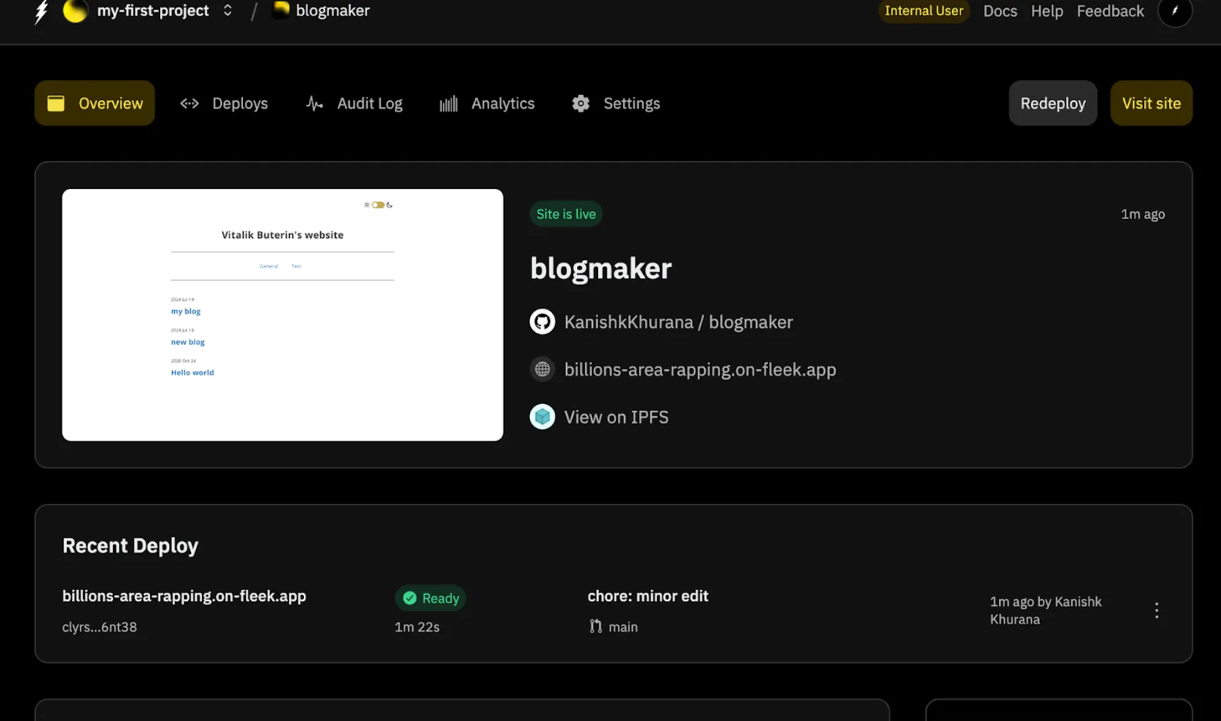 Congratulations!! You have now covered all the flows related to deploying Vitalik’s Blogmaker Template on Fleek. We hope to see your knowledgeable blog websites soon and if you have any questions, please reach out to us here.