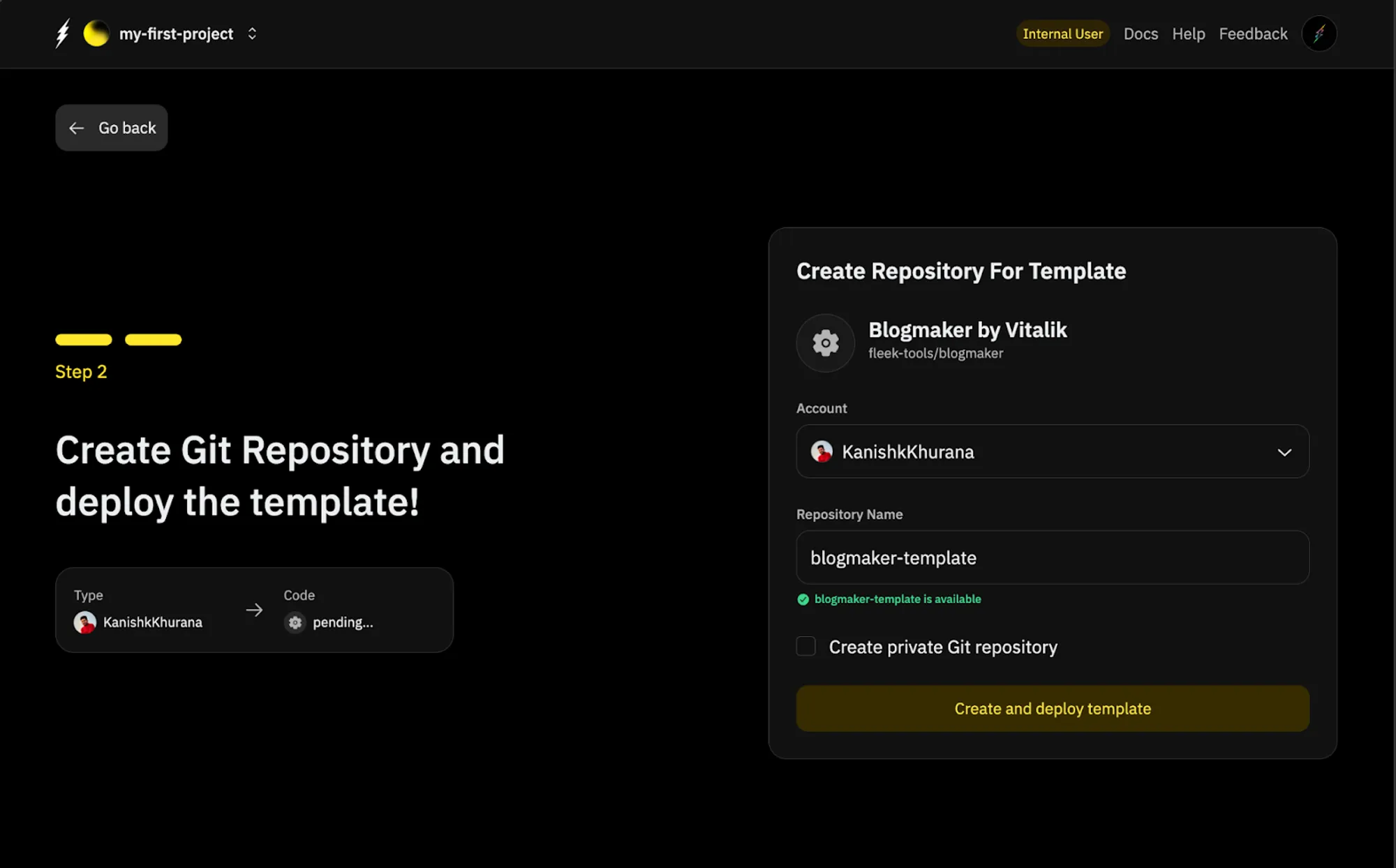 - Fleek will now inject the Blogmaker Template code repository in your GitHub account so you have full access and permissions to edit it later on. Select the correct GitHub account and give your repository an appropriate name. Then click on “Create and deploy template” -
