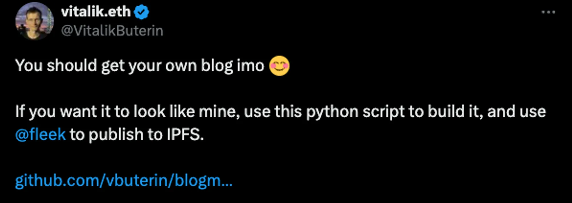 Vitalik Buterin’s website has been a community-favorite resource for blockchain and web3 knowledge since its inception. It contains valuable information on the Ethereum roadmap and technical deep dives on all sorts of concepts relevent to the onchain ecosystem as a whole– but, did you know all of this is deployed on Fleek?
