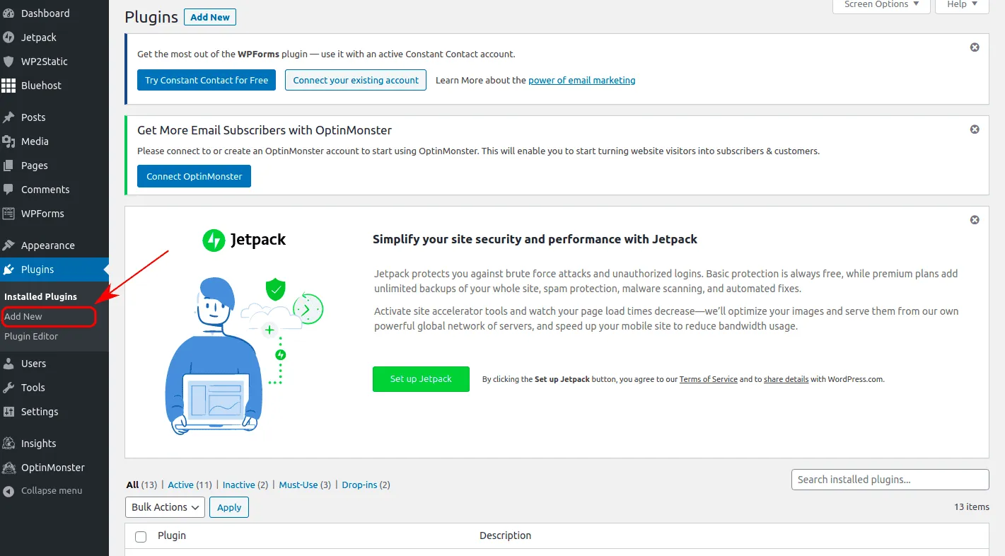 First, we must install a plugin that will allow us to export the site’s HTML, CSS, and JavaScript files. In the Wordpress site’s admin panel go to “Plugins” => “Add New” on the left-hand side menu.