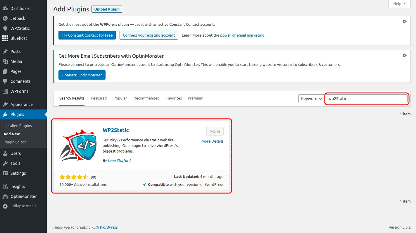 Next, search for the plugin called “WP2Static”, download it and activate it.