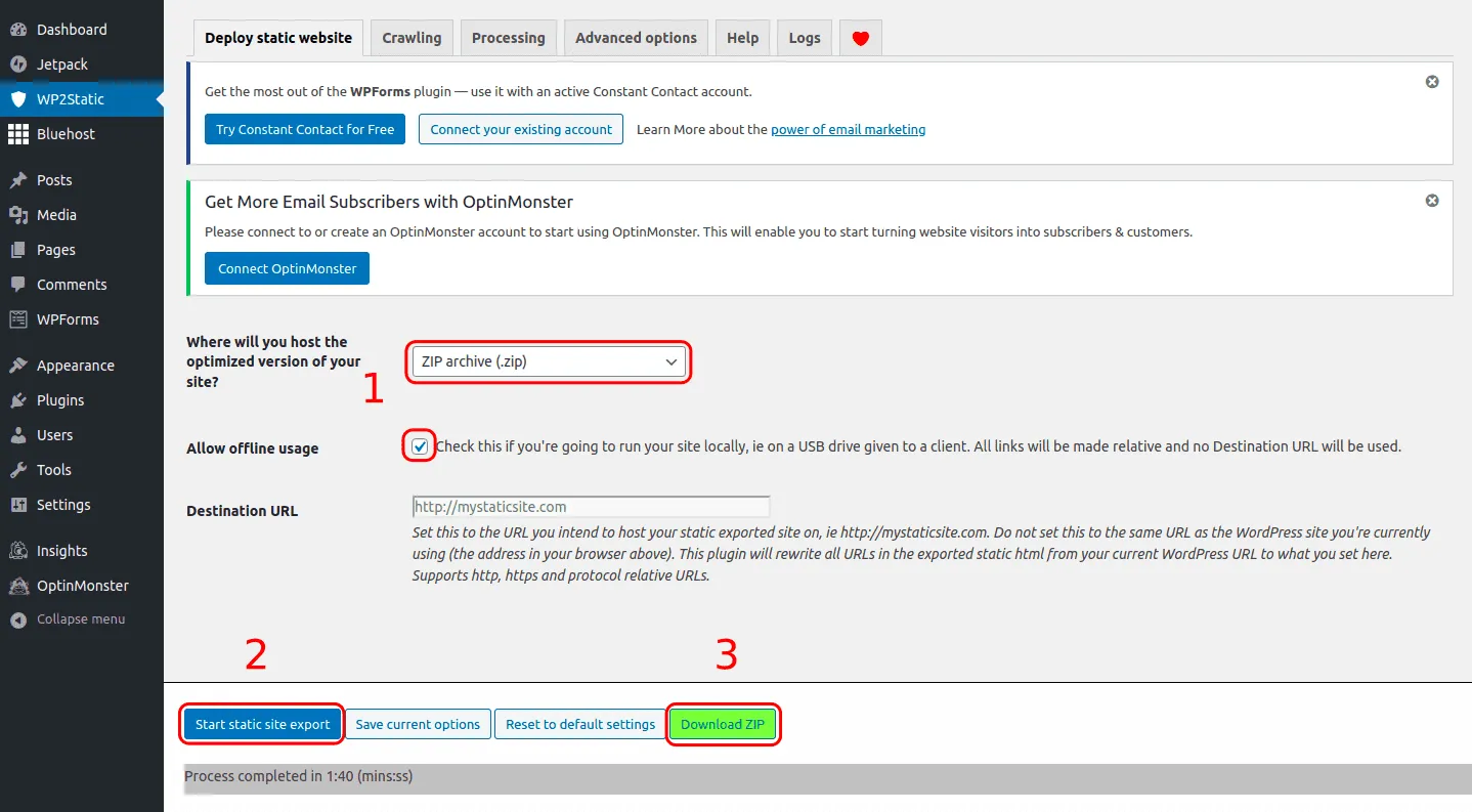 The plugin will create a new menu option on the left-hand side menu name “W2PStatic”.When clicking on it, we must fill the form as shown in the image below by selecting the “Zip archive (.zip)” in the dropdown menu and checking the “Allow offline usage” option. This will create a zip archive with no preset root path which will render the site’s paths compatible with the IPFS deployment. After that, click “Start static site export”, wait until the export is done, and download the file via the “Download ZIP” button.