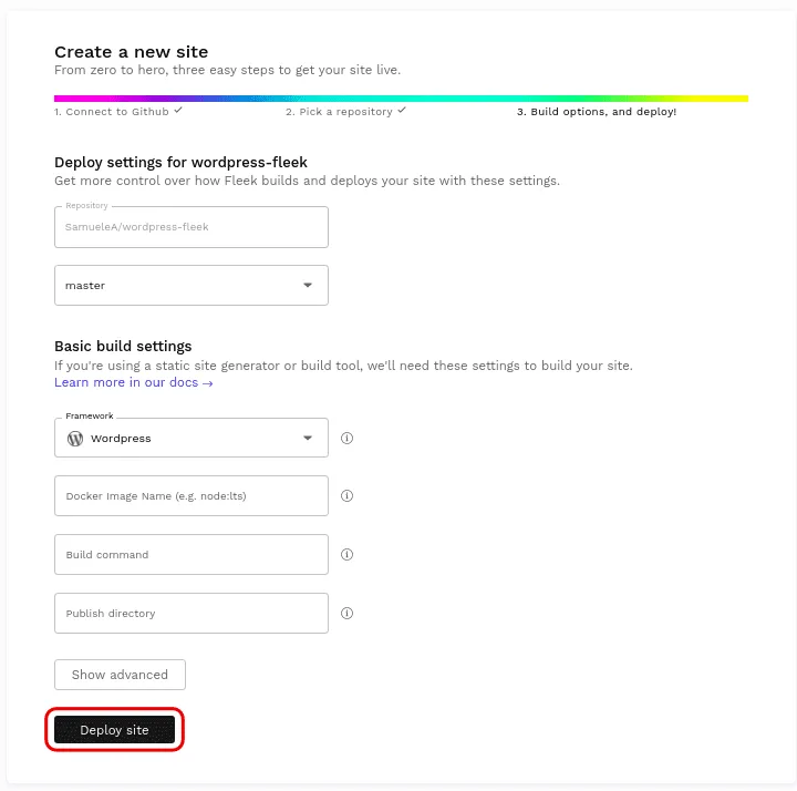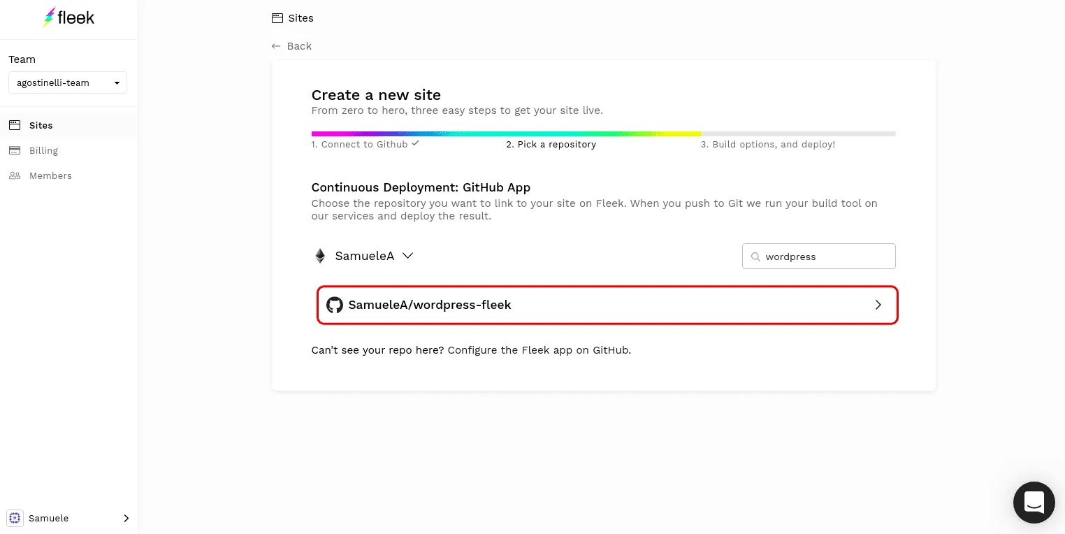 Fleek will take care of deploying the site to IPFS. To allow Fleek to get the files, we must first push the exported site to github. To do so, simply create a new repository and follow the instructions. Once you are done, the result should look similar to the following repo: https://github.com/SamueleA/wordpress-fleek, with the index.html file in the root folder. Then, we log into Fleek and add a new site.