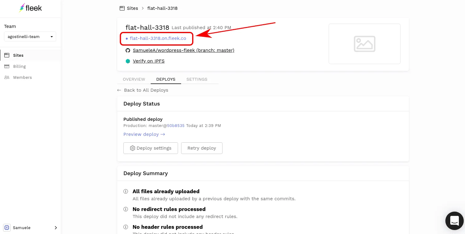 And that is all! Once the site is done deploying, which should take around a minute, the site will be available through the .tmnl.co address in blue. In our case, the blog is now accessible through IPFS at this address:Â https://flat-hall-3318.on.fleek.co/